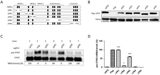 - Fourati, Z.; Roy, B.; Millan, C.; Coureux, P.D.; Kervestin, S.; van Tilbeurgh, H.; He, F.; Uson, I.; Jacobson, A.; Graille, M. A highly conserved region essential for NMD in the Upf2 N-terminal domain. J. Mol. Biol. 2014, 426, 3689–3702. [Google Scholar] [CrossRef] [PubMed]