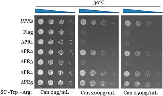 S. cerevisiae strain S288C derivative upf2Δ(Mat ɑ, ura3-52, trp1-Δ1, leu2-2, tyr7-1, can1-100, his3-Δ200, upf2Δ1: HIS3) was used for all the experiments performed in this study. The yeast 2 micron plasmid pG-1 containing the Flag-UPF2 allele was used as the vector [43]. Deletions of upf2 were constructed using the Flag-UPF2 allele as a template, subjected to the single-step cloning method [44]. Briefly, a pair of 5’-phosphorylated inverse primers separated by the region to be deleted was utilized for amplification, ensuring that the two primers were similar in size. The PCR mixture comprised 150 ng of each primer (Integrated DNA Technologies, Coralville, IA, USA), 50 ng of template plasmid DNA, 200 mM dNTPs, 2.5U Pfu Turbo DNA polymerase (Stratagene, San Diego, CA, USA), and the buffer supplied with the polymerase in a total volume of 50 mL. PCR was executed under the following conditions: denaturation at 95 °C for 3 min, followed by 18 cycles of denaturation at 95 °C for 45 s, annealing at 62 °C for 1 min, and extension at 68 °C for 2 min/kb template.