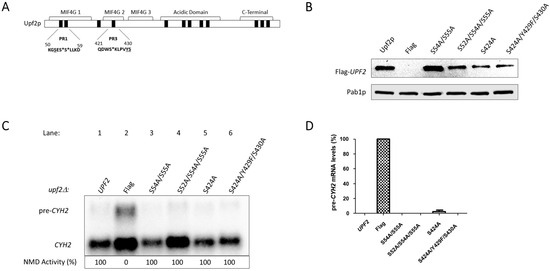 In this article we have identified twelve phosphorylated residues in S. cerevisiae Upf2p of which two are in the mIF4G-1 domain (S54 and S55) and one in the mIF4G-2 (S424) (Figure 3A,B). Our mutation analysis showed that phosphorylated residues within these domains do not disrupt NMD activity (Figure 7C,D). We have also identified two regions consisting of ten residues each (residues 50–59 and 421–430) harbored within Upf2p mIF4G-1 and Upf2 mIF4G-2, respectively, which are essential for function of the NMD mechanism (Figure 5C,D). By generating smaller deletions within these regions we demonstrated that the deletion of amino acids segments containing a minimum of three residues within mIF4G-1 and mIF4G-2 was sufficient to reduce the activity of NMD (Figure 9C,D).