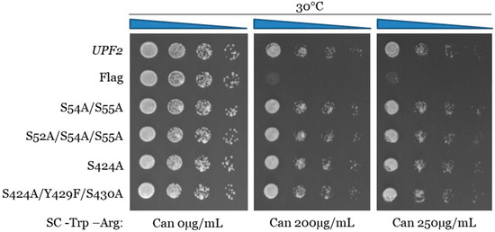 The serine and tyrosine residues were mutated to alanine and phenylalanine, respectively, to mimic unphosphorylated versions of these amino acids. One single point mutant (S424A), one double mutant (S54A/S55A), and two triple mutants (S52A/S54A/S55A and S424/Y429F/S430A) were generated. Expression of these upf2 mutants was confirmed by Western blotting (Figure 7B). Northern blot analysis of total cellular RNA isolated from WT and the five mutant strains were used to determine NMD activity as described previously. As anticipated, NMD was not impaired, as its activity in the wild-type strain was 100%, while no activity was observed in the upf2Δ strain (Figure 7C, compare lanes 1 and 2). All the mutant constructs retain NMD activity at a level like the WT (Figure 7C,D; compare lane 1 with lanes 3, 4, 5 and 6). Likewise, none of the mutant strains showed a decrease in growth in the presence of canavanine (Figure 8 and Figure S3). Taken together, these data suggest that both NMD activity and translation termination accuracy are independent of the phosphorylation of S52, S54, and S424. In addition, nearby residues S52, Y429, and S430 do not have a redundant phosphorylation role in the absence of phosphorylated residues S54, S55, and S424, and are also not essential for NMD activity and translation termination.