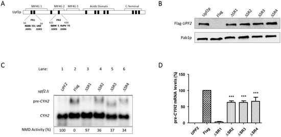 NMD activity requires Upf2p mIF4G-1 and mIF4G-2 non-phosphorylated segments. (A) Illustrative representation of Upf2p non-phosphorylated segments (SR) within phospho-region (PR) 1 and 3. Depicted by a strikethrough, in segment 1 (SR1) residues K50–E53 were deleted, in segment 2 (SR2) residues L57–D59 were deleted, segment 3 (SR3) residues Q42–W423, and in segment 4 (SR4) residues K425–V428 were removed. (B) Analysis of cytoplasmic extracts by Western blot showing Upf2 expression. Poly(A) binding protein (Pab1) was used as a loading control. (C) Northern blot from total cellular RNA was used to determine NMD activity of the Upf2p non-phosphorylated segments deletions. (D) pre-CYH2 mRNA accumulation from Northern blot expressed as a mean value ± standard deviation. Significance of results, when compared to the WT strain, are represented by asterisks (*** p < 0.001).