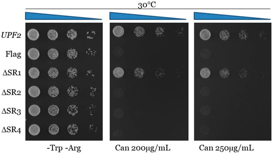 The activity of the studied regions appeared to be independent of their phosphorylation status, but, since the absence of these regions diminishes NMD activity, which might be due to impairments in the structure of Upf2p, we sought to further characterize them by studying other segments within them. To assess their role in NMD, two segments containing up to a maximum of four residues were deleted from each mIF4G region of the Flag-UPF2 allele plasmid vector. The deleted segments were Segment 1) (K50–E53), Segment 2) (L57–D59) from phospho-region 1 in mIF4G-1, Segment 3) (Q421–W423), and Segment 4) (K425–V428) from phospho-region 3 in mIF4G-2. Constructs harboring these deletions were transformed into an upf2Δ strain (Figure 9A). Expression of these upf2 mutants was confirmed by Western blotting (Figure 9B). The WT and mutant strains were subjected to Northern blot analysis to determine the NMD activity as described above. Levels of pre-CYH2 mRNA showed a reduction of NMD activity of 64%, 63% and 66% for mutants lacking residues L57–D59, Q421–W423 and K425–V428, respectively (Figure 9C,D; lane 4–6). In contrast, deletion of residues K50–E53 had no significant effect on NMD activity (Figure 9C,D; lane 3). Results from the can1-100 nonsense suppression assays show that deletion of segment 1 (K50–E53) did not present a nonsense suppression phenotype like the wild-type UPF2 strain (Figure 10 and Figure S4). In contrast, strains harboring the deletion of segment 2 (L57–D59), segment 3 (Q421–W423), and segment 4 (K425–V428) exhibited reduced growth in the presence of canavanine, pointing to a decrease in translation termination efficiency (Figure 10 and Figure S4). All together, these data suggest that the regulation of NMD is modulated by non-phosphorylated residues residing within segment 2 (L57–D59) of mIF4G-1, and within segments 3 (Q421–W423) and 4 (K425–V428) of mIF4G-2.