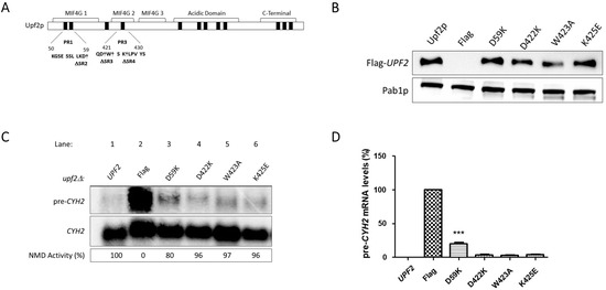 NMD activity requires Upf2p mIF4G-1 residue D59. (A) Illustrative representation of Upf2p sub-region mutants. Residues D59, D422, W423, and K425, which were substituted, are depicted with a dagger (†). (B) Analysis of cytoplasmic extracts by Western blot showing Upf2p expression. Poly(A) binding protein (Pab1) was used as a loading control. (C) Northern blot from total cellular RNA was used to determine NMD activity of the Upf2p single mutant deletions. (D) pre-CYH2 mRNA accumulation from Northern blot expressed as a mean value ± standard deviation. Significance of results, when compared to the WT strain, are represented by asterisks (*** p < 0.001).