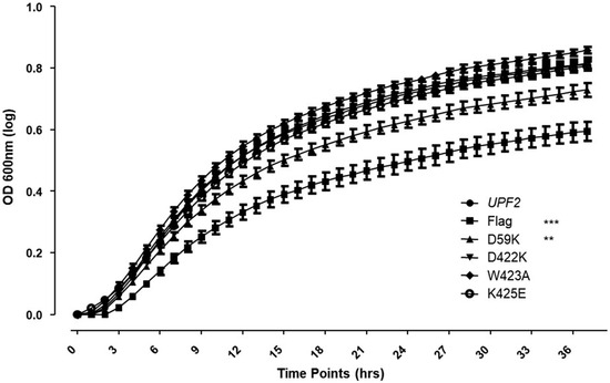 Effects seen on NMD regulation when mIF4G segments 2, 3, and 4 were deleted may be due to an impairment of Upf2 structure. To discard this possibility, we tested the role of the essential residues within these segments of mIF4G-1 and mIF4G-2 through single mutants generated using site-directed mutagenesis on the Flag-UPF2 allele plasmid vector (Figure 11A). Charged residues were mutated to incorporate charge inversions. Negatively charged residues D59 and D422 were substituted by lysine generating D59K and D422K. The positively charged residue K425 was substituted by glutamic acid generating K425E, while neutral residue W423 was substituted by alanine generating W423A. The expression of these mutants was confirmed by Western blotting (Figure 11B). Total cellular RNA isolated from WT and the five different point mutant strains were analyzed by Northern blot and NMD activity was ascertained as described above. Levels of pre-CYH2 mRNA showed a 20% reduction of NMD activity for the point mutant D59K (Figure 11C,D; lane 3). In contrast, point mutants D422K, W423A and K425E had no significant effect on NMD activity. (Figure 11C,D; lane 4–6). Likewise, the point mutant D59K showed a decrease in growth when grown in the presence of canavanine (Figure 12 and Figure S5). Taken together, these data suggest that the regulation of NMD is influenced by the residue D59 residing within the mIF4G-1 of Upf2p.