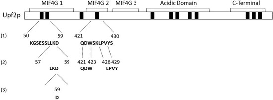 - Clerici, M.; Deniaud, A.; Boehm, V.; Gehring, N.H.; Schaffitzel, C.; Cusack, S. Structural and functional analysis of the three MIF4G domains of nonsense-mediated decay factor UPF2. Nucleic Acids Res. 2014, 42, 2673–2686. [Google Scholar] [CrossRef]