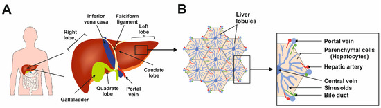 The liver is the largest gland in the human body, mediating essential functions in homeostasis, metabolism, serum protein production, storage of glycogen, drug detoxification, immune system, and production and secretion of bile acids [1]. The liver has a lobular structure and is divided into three major zones: zone I supplies oxygen and nutrients to the hepatocytes, zone II connects the zones, and zone III performs glycogenesis, detoxification, and lipogenesis functions [2]. These diverse functions are made possible by the synchronized functioning of different cell types. The functional unit of the liver is a lobule, hexagonal in shape (Figure 1) [2].