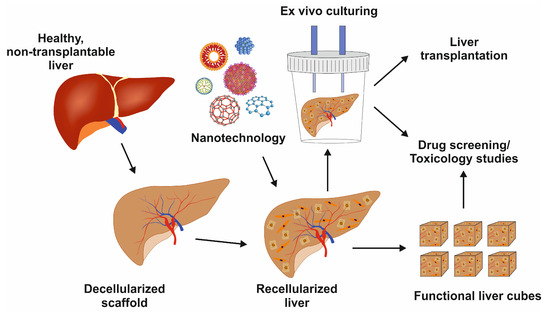 Image showing the decellularized liver scaffold, recellularization with nanotechnology support, and its potential uses for liver transplantation, drug development, or toxicology studies.