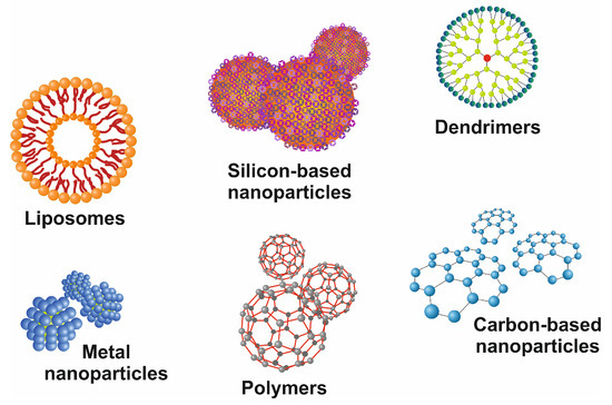 Representative images of commonly used nanoparticles. There are different classes of drug delivery devices available, including polymers, repetitively branched molecules (dendrimers), bilayered lipid vesicles (liposomes), paramagnetic iron-oxide nanoparticles, and nanoparticles composed of other metals, silicon, or carbon. All these nanocarriers have precise-branched structures and can be functionalized by covalently or non-covalently linked surface modifications.