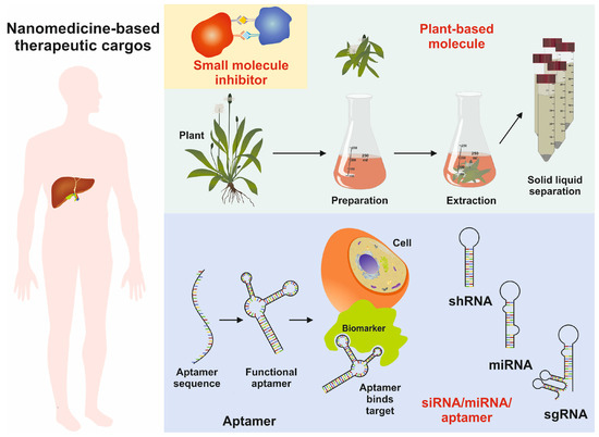 Image showing the usage of nanoparticles as therapeutic cargoes, including functional aptamers, miRNA, shRNA, sgRNA, and natural small molecules of plant origin.