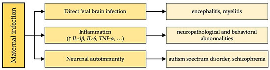 - Chemical mediators of infection may mediate changes in brain development. During maternal infection, levels of chemical mediators of inflammation, primarily cytokines, interleukin-1β (IL-1β), IL-6, and tumor necrosis factor-α, increase in the maternal blood and placenta. Such cytokines can influence fetal brain development by directly affecting the fetal brain, interfering with placental function, or exerting effects through the mother. The fever-like state itself, because of the increased release of maternal cytokines, can affect the development of the fetal nervous system. Studies examining the risks associated with increased maternal body temperature have shown that even short-term exposure of pregnant rodents to high temperatures can lead to abnormalities in the central nervous system [42].
