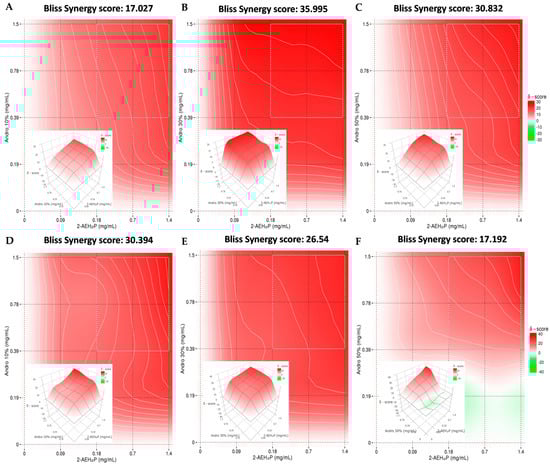 A similar result was observed for the treatment with the MDA MB-453: for the associated treatment of 2-AEH2P with A. paniculata at 10%, the synergism value was 30.39; for the treatment at the 30% concentration, the synergism value was 26.54; and for the association at the 50% concentration, it was 17.19 (Figure 7D–F). All treatments proved to be efficient in reducing the viability of tumor cells, and from the calculation coefficient following the Bliss method, these associations have a synergistic effect, where one molecule enhances the action of the other.