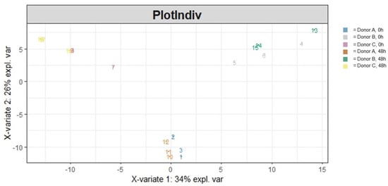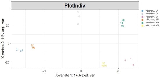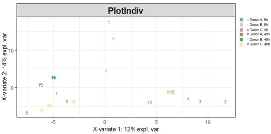 A PLS-DA ordination visualizing the effects of treatment and donor influencing community functional heterogeneity using the GO Term database following 48 h of colonic simulation. Numbers 1 through 9 refer to AG1-treated samples and numbers 10 through 18 refer to blank-control-treated samples. Numbers 1 through 3 and 10 through 12 refer to Donor A, numbers 4 through 6 and 13 through 15 refer to Donor B, and numbers 7 through 9 and 16 through 18 refer to Donor C.