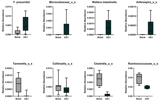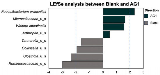 We extended the specific taxonomical investigations to all phylogenetic levels. Using the LEfSe methodology and subsequent LDA (Figure 3), we identified eight statistically significant taxa that differed between the AG1- and blank-control-treated microbiota. Of these, Faecalibacterium prausnitzii, Microcoleaceae, Waltera intestinalis, and Arthrospira were enriched in the AG1-treated samples. Conversely, Tannerella, Collinsella, Clostridia, and Ruminococcaceae were enriched in the blank-treated samples (Figure 4).
