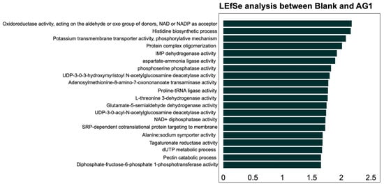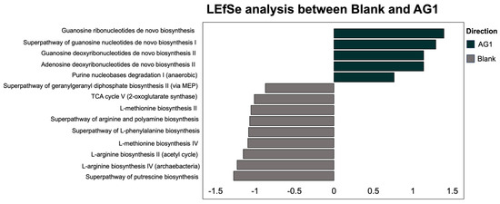 Using the LEfSe methodology and subsequent LDA statistical analysis, we identified 20 functional pathways from the GO Terms that were explicitly enriched in the AG1-treated microbiota communities and no pathways that were enriched in the blank-control-media-treated microbiota communities (Figure 7). For the MetaCyc pathway database, a total of five functional pathways were enriched in the AG1-treated samples while nine functional pathways were enriched in blank-control-media-treated samples (Figure 8).