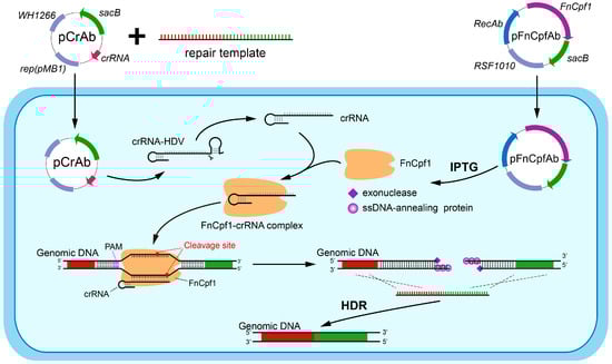 Schematic diagram of the procedures for CRISPR-FnCpf1-mediated genome-editing. The FnCpf1-crRNA complex recognizes and cleaves the target site and generates lethal double-strand break (DSB) in the genome of A. baumannii. The DSB is then repaired by the RecAb recombination system using a donor template, resulting in programmable genome modification.