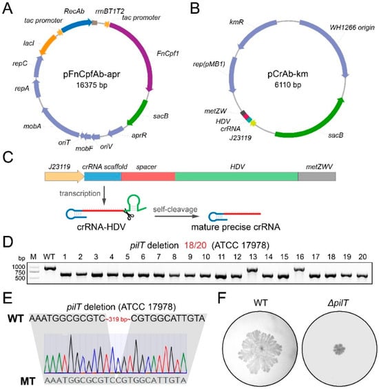 CRISPR-FnCpf1 coupled with the RecAb system enables efficient gene editing in A. baumannii. (A) Map of the pFnCpfAb-apr plasmid. The expressions of both the FnCpf1 nuclease and the RecAb recombination proteins are driven by the IPTG-inducible tac promoter. aprR—the apramycin resistance marker; sacB—sucrose-counter-selectable marker for plasmid curing after editing. (B) Map of the pCrAb-km plasmid. J23119, the promoter for crRNA expression; HDV, hepatitis delta virus ribozymes for precise RNA processing; kmR, the kanamycin resistance marker; and sacB, sucrose-counter-selectable marker for plasmid curing after editing. (C) Scheme of mature precise crRNA generation. The 3′-positioned HDV ribozymes mediate self-cleavage exactly to generate mature precise crRNA. (D) The pilT gene was successfully deleted with an efficiency of 18/20 in the A. baumannii ATCC 17978 strain, confirmed by PCR screening. M—Trans2K Plus II DNA Marker; WT—wild-type; 1–20—twenty randomly picked colonies. (E) The 317 bp within the pilT gene was deleted as expected, confirmed by Sanger sequencing. (F) The disruption of the pilT gene resulted in reduced twitching motility. WT—wild-type; ΔpilT—pilT deletion strain.