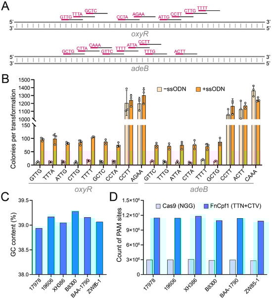 Considering the low GC content of the A. baumannii genome, we selected six strains with complete genome sequences from the GenBank database to calculate their GC content (Figure 3C) and the number of PAM sites for FnCpf1 and Cas9 (with a 5′-NGG-3′ PAM), respectively. As shown in Figure 3D, the number of FnCpf1 PAM sites is nearly four times higher than that of Cas9 in each strain, suggesting that genome editing with FnCpf1 provides greater target site selectivity and flexibility in A. baumannii.