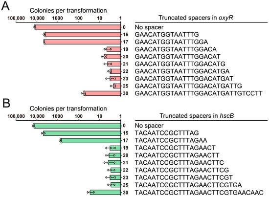 Spacer length requirement of FnCpf1-mediated gene editing in A. baumannii. The colonies produced by electroporating the pCrAb-km plasmids containing various truncated spacers into the IPTG-induced pFnCpfAb-apr-harboring A. baumannii cells to target the oxyR gene (A) and the hscB gene (B), respectively. The pCrAb-km plasmid containing no spacer was used as control. Data were means ± SD (n = 3).