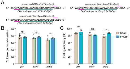 Comparison of Cas9 and FnCpf1 editing performance at three identical sites in the A. baumannii ATCC 17978 strain. (A) Three target sites, located in pilT, oxyR, and pmrB, harbor the canonical PAMs of Cas9 and FnCpf1 on both ends. (B) The FnCpf1 system yielded a similar number of colonies as the Cas9 system when using the same spacer to edit the same region. Data were means ± SD (n = 3). Two-tailed Student’s t-test was used for statistical analysis. (C) Cas9 and FnCpf1 systems exhibited similar editing efficiencies at the pilT and the oxyR loci; however, FnCpf1 system exhibited slightly higher editing efficiency at the pmrB locus when using the same spacer to edit the same region. Data were means ± SD (n = 3). Two-tailed Student’s t-test was used for statistical analysis (ns, no significance; * p < 0.05).