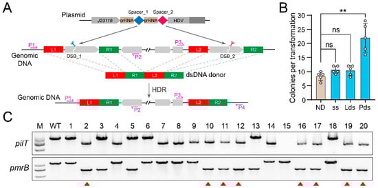 To investigate the multiplex editing ability of the CRISPR-FnCpf1 tool, the J23119-crRNA_pilT-crRNA_pmrB-HDV-metZWV expression cassette was assembled to target the pilT gene and the pmrB gene simultaneously (Figure 7A). We tested three types of donor DNA, including a mixture of ssODN_pilT and ssODN_pmrB, linear dsDNA, and plasmid-borne dsDNA, as repair templates. After transformation of the two-spacer-introduced pCrAb-km plasmid and the corresponding donor DNA, different colony numbers were observed. As shown in Figure 7B, only the transformation with the plasmid-borne dsDNA repair template resulted in a significant increase in colony numbers, while the transformation with linear dsDNA or ssODN showed no significant difference in colony numbers compared to that of the no repair template (Figure 7B). Two pairs of primers covering the editing regions were designed and used to verify the simultaneous editing events. Further PCR screening showed that out of 20 randomly selected colonies, 8/20 colonies achieved simultaneous editing of the pilT and pmrB genes (Figure 7C), manifesting the capacity for multiplex gene editing in A. baumannii.