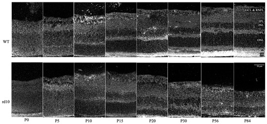 In our data, WT and rd10 retinas were confirmed to remain structurally the same throughout the first 15 days of development [3,4,29]. As per Samardzija et al., and as confirmed in our results, after P15, WT photoreceptor outer segments continue growing till P28, following which their size stays relatively stable [4]. In our rd10 mice and those in the literature, after P15, photoreceptor outer segments visibly degenerated and almost completely disappeared by P28.