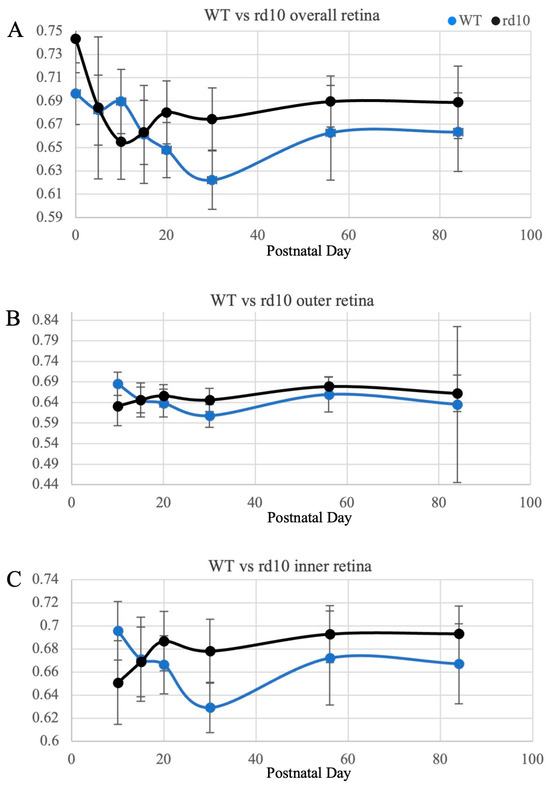 Percentage of bound NAD(P)H in the wild-type (WT) and rd10 mice retina over time. (A) Overall retina. (B) Outer retina. (C) Inner retina. Note that for the outer and inner retinas, the measurements started at P10. The rd10 retinas also showed higher percentages of bound NAD(P)H relative to their WT counterparts at almost all time points.