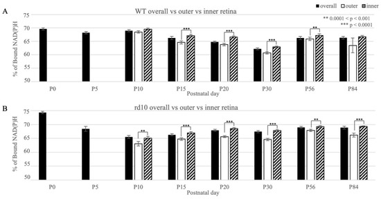 Percentage of bound NAD(P)H in the wild-type (WT) and rd10 mice retinas, comparing the overall, outer, and inner retina measurements. Measurements for the outer and inner retinas started at P10. (A) WT mice. (B) rd10 mice. Statistically significant differences between the outer and inner retinas are indicated above the bars, with more asterisks (*) denoting higher levels of significance (** 0.0001 < p < 0.001;*** p < 0.0001). There were higher percentages of bound NAD(P)H in the inner retina compared to the outer retina, a finding that was indicative of more OXPHOS and was mostly statistically significant across the timepoints in both strains.