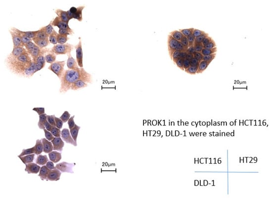 Immunostaining analysis confirmed the cytoplasmic expression of PROK1 in the HCT116, HT29, and DLD-1 cell lines (Figure 1).