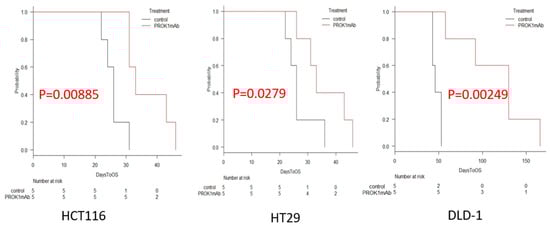 Comparison of survival times. Mice injected with HCT116, HT29, and DLD-1 cells exhibited a significant increase in survival time when treated with the anti-PROK1 mAb. The survival curve was created via the Kaplan–Meier method.