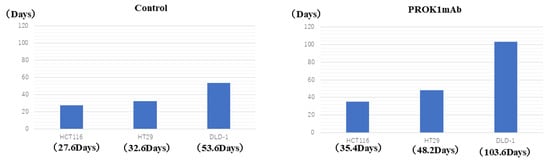The average survival time. Mice injected with HCT116, HT29, and DLD-1 cells exhibited a significant increase in the average survival time when treated with the anti-PROK1 mAb.