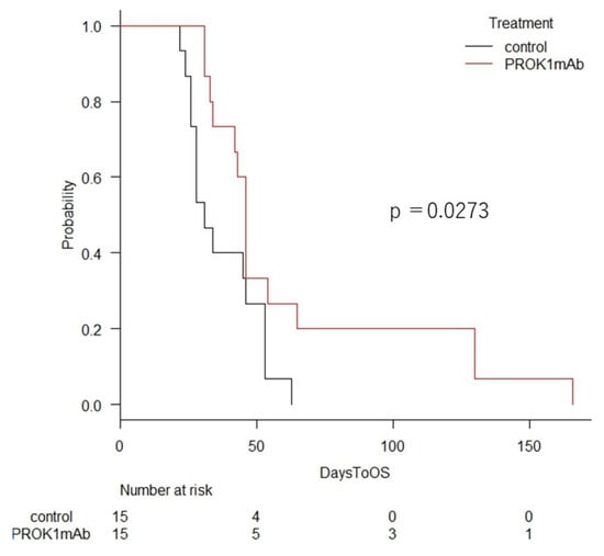 Mice injected with colon cancer cells exhibited a significant increase in median survival time when treated with the anti-PROK1 mAb. The survival curve was created via the Kaplan–Meier method (control vs. the anti-PROK1 mAb group, 31 vs. 46 days; p = 0.00273).