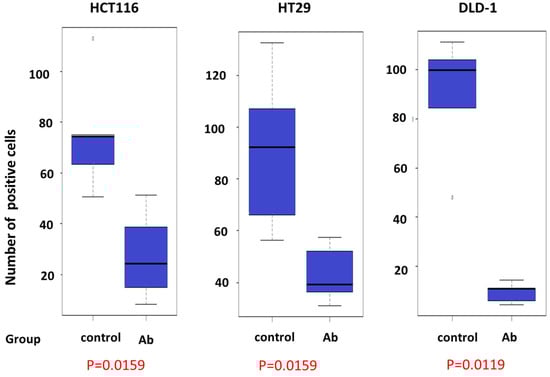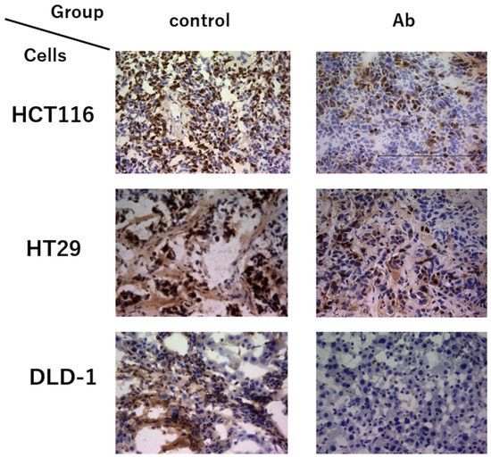 The median numbers of Ki67-positive cells (Figure 6) in each group were compared (Figure 7). For HCT116, the median number was 74.3 and 24.3 positive cells per visual field in the control and antibody groups, respectively (p = 0.0159). For HT29, the median number was 92.3 and 39.3 positive cells per visual field in the control and antibody groups, respectively (p = 0.0159). For DLD-1, the median number was 99.7 and 11.0 positive cells per visual field in the control and antibody groups (p = 0.0119). These results demonstrated that liver metastasis-positive cells significantly decreased for all antibody-treated groups for all cell lines in these animal models. On the other hand, immunostaining for PROK1 in liver metastases also showed a significant difference in the number of positive cells between the two groups (p = 0.0167). The median number of PROK1-positive cells in each group was compared; the median number of positive cells per field of view was 11 in the control group and 25 in the antibody group. However, the trend differed depending on the type of cell line. For HCT116, the median number was 11 and 23 positive cells per visual field in the control and antibody groups, respectively (p = 0.074). For HT29, the median number was 11 and 46 positive cells per visual field in the control and antibody groups, respectively (p = 0.0117). For DLD-1, the median number was 26 and 15 positive cells per visual field in the control and antibody groups (p = 0.832). PROK1-positive cells in HCT116 and HT29 tended to be more numerous in the antibody group. However, this was reversed for DLD-1, with more positive cells in the control group. This difference may be due to the expression of PROK1 protein in each cell line.
