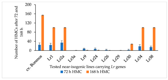 Number of haustorial mother cells (HMCs) produced 72 and 168 h after inoculation with P. triticina fungal isolate 77WxR in 10-day-old seedlings of the LR-susceptible standard cv. Borenos (control), Lr1, Lr2a, Lr3a, Lr9, Lr24, Lr26, Lr29, Lr30, Lr34, and Lr38. These Lr genes are race-specific APR genes carried by near-isogenic lines (NILs). Values are the mean ± standard deviation of 15 infected leaf area sites.