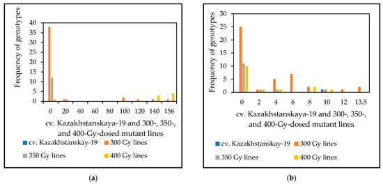 Frequency distribution of genotypes in haustorial mother cells (HMCs) produced 72 (a) and 168 (b) hours after inoculation with 77WxR P. triticina in 10-day-old seedlings of M3 spring wheat mutant lines generated using cv. Kazakhstanskaya-19 through 300-, 350-, and 400-Gy irradiation. Values are the mean of 15 infected leaf area sites ± standard deviation. A list of spring wheat genotypes is presented in Supplement S1.