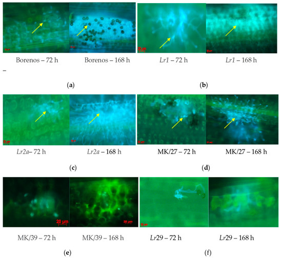 In line with the large number of HMCs detected (Figure 1 and Figure 2) at 72 and 168 hai with 77WxR in SS cv. Borenos (Figure 3a), SS Lr1 (Figure 3b), SS Lr2a (Figure 3c), and SS Kazakhstanskaya-19 350-Gy-dosed MK/27 mutant lines (Figure 3d), clear progressive production of uredospore pustules on leaves was observed as a temporary reaction. Most of the pustules had a particular root-like network with blue balls or dots (indicated by yellow arrows). In the Kazakhstanskaya-19 350-Gy-dosed MK/39 mutant line selected as the SR (Figure 3e and Supplement S1) and in the SR Lr29 line (Figure 3f), no development of HMCs and uredospore pustules was observed. In addition, autofluorescence as an indicator of plant defense reactions that could prevent the formation of HMCs was most visible at 72 and, to a lesser extent, 168 hai (Figure 3e,f). In accordance with this phenomenon, no HMCs were formed in SR genotypes to LR selected at both infection durations.