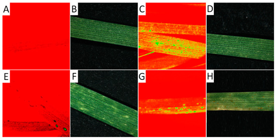 Hyperspectral image of leaves from seedlings 14 days after germination. Hyperspectral images were taken at a wavelength of 694.57 nm (A,C,E,G) and separately as RGB images (B,D,F,H) of a non-infected leaf (A,B), an infected leaf from already-developed but not yet macroscopically visible uredospore pustules (C,D), a leaf showing hypersensitive reaction after an infection (E,F), and a leaf rust-infected leaf showing uredospore pustules.