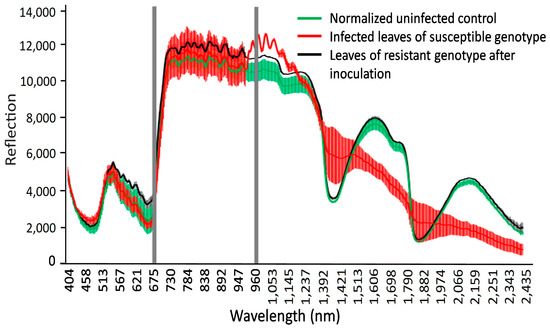 Reflectance of non-(green), infected leaves of susceptible genotypes (red), and resistant genotypes showing hypersensitive spots (black). Gray areas show wavelengths with the most significant differences in reflectance at 694.57 and 987.51 nm.