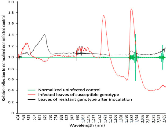 The normalized reflection values in wavelengths from 404 to 2511 nm, with 3 nm spectral resolution, for non-infected and LR-infected seedlings in spring wheat mutant lines two weeks after inoculation. Fifteen samples each were used for non-infected (green line), infected (red line), and resistant genotypes (black line) (hypersensitive spots). Leaves of infected wheat genotypes showed a relative reflectance increase in visible light, with the highest reflectance at 462 nm and 644 nm and peak near-infrared reflectance at 1936 nm and 2392 nm.