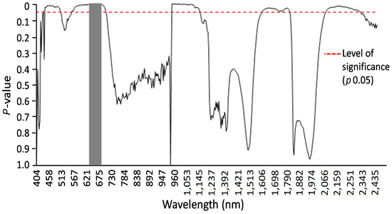 Results of F-tests at alpha 0.05 (marked by the red dashed line) of hyperspectral imaging system analysis for susceptible and resistant spring wheat mutant lines two weeks after LR infection. A Tukey’s test (alpha 0.05) was used to compare averages of reflection values with significant F-test results. Significantly different reflectance values could be identified and are marked by the gray vertical area.