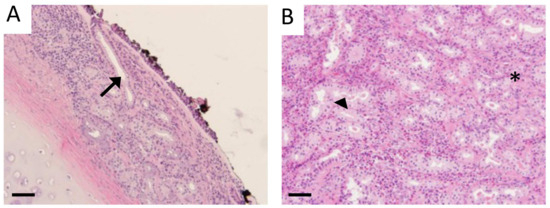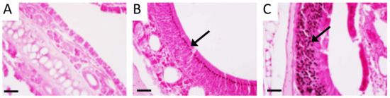 H&E staining of human tissue from CS patients (B) revealed hyperplasia of goblet cells and submucosal glands (*), stromal edema, and leukocyte extravasation (arrowhead) compared to normal control tissue (arrow, A). Images are representative of 4 randomized fields obtained from 8 samples from each group and scale bars are 50 mm.