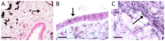 Immunohistochemistry for RAGE in normal human sinus tissue revealed only faint staining in submucosal glands (A, arrow) and intense staining of vasculature (A, arrowhead). In samples from CS patients, RAGE was intensely localized to respiratory epithelium (B, arrow) and basolateral edges of glandular epithelium in the mucosa (C, arrow). Images are representative of 4 randomized fields obtained from 8 samples from each group and scale bars are 50 mm.