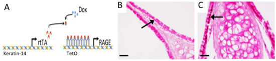 Because exposure to tobacco smoke causes and often exacerbates CS, we next sought to assess RAGE expression in sinus tissues following exposure to SHS. We did not observe RAGE expression in sinus epithelium isolated from control mice exposed to room air (Figure 4A). However, abundant RAGE expression was observed in sinus epithelium in mice following acute exposure to SHS for 6 weeks (Figure 4B). Moreover, RAGE was also elevated in mucosal cells following SHS exposure (Figure 4C). Total RAGE immunoreactivity in control mouse sinus tissue was 1.0 ± 0.13 and 1.87 ± 0.17 in sinus tissues from mice exposed to SHS. As RAGE expression in sinus tissue increases following SHS exposure (Figure 4), we next contemplated genetically inducing RAGE expression, in the absence of SHS, in order to model RAGE-mediated sinus compromise. Accordingly, we utilized a Tet-On mouse model in order to up-regulate RAGE expression in sinus cavities. We used a mouse that harbored an rtTA transgene downstream of the keratin-14 promoter and a separate line that contained a RAGE cDNA sequence under the control of TetO response elements (Figure 5A). Double transgenic mice that contain both transgenes (RAGE TG) expressed RAGE when fed dox. RAGE was not detected in sinus epithelium in non-transgenic controls (Figure 5B), which was similar to the lack of RAGE expression in room air control mice (Figure 4A). RAGE TG mice fed dox for 6 weeks experienced abundant RAGE expression in sinus epithelium observed via immunohistochemical staining for RAGE (Figure 5C, arrow).