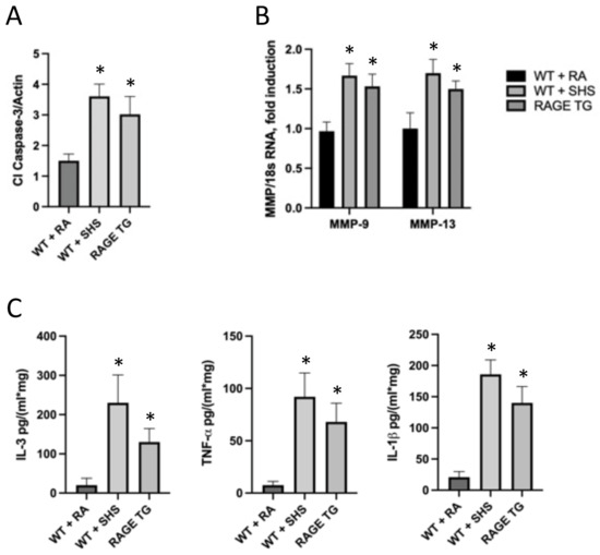 Active caspase-3 isoforms were increased in SHS-exposed WT and RAGE TG mice compared to controls (A). MMP mRNA transcripts were significantly elevated in SHS-exposed and RAGE TG mice compared to room air controls (B). IL-3, TNF-α and IL-1β were significantly elevated in SHS-exposed WT and RAGE TG mice compared to controls (C). * in the figure indicates a significant difference.