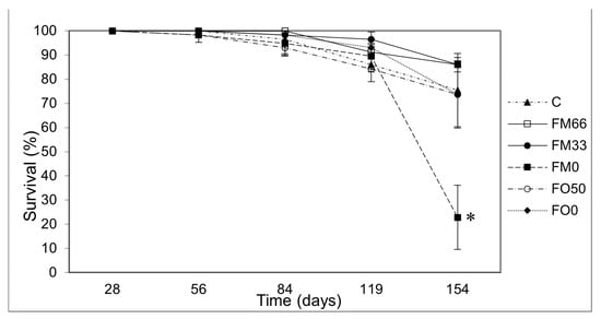 - Monge-Ortiz, R.; Tomás-Vidal, A.; Rodriguez-Barreto, D.; Martínez-Llorens, S.; Pérez, J.A.; Jover-Cerdá, M.; Lorenzo, A. Replacement of Fish Oil with Vegetable Oil Blends in Feeds for Greater Amberjack (Seriola dumerili) Juveniles: Effect on Growth Performance, Feed Efficiency, Tissue Fatty Acid Composition and Flesh Nutritional Value. Aquac. Nutr. 2018, 24, 605–615. [Google Scholar] [CrossRef]