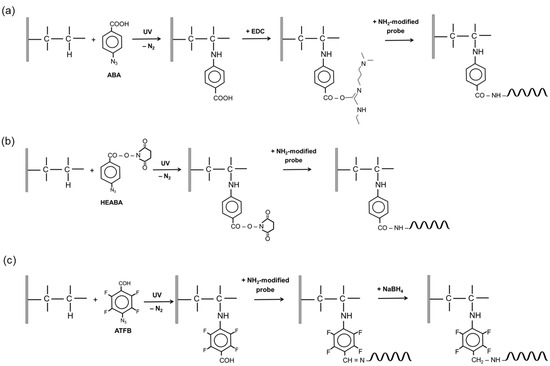 - Dankbar, D.M.; Gauglitz, G. A study on photolinkers used for biomolecule attachment to polymer surfaces. Anal. Bioanal. Chem. 2006, 386, 1967–1974. [Google Scholar] [CrossRef]
