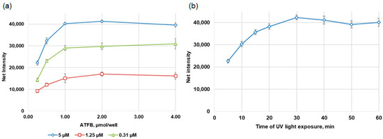 3.1. Photoactivation of 96-Well Polystyrene Plates with Different Bifunctional Linkers