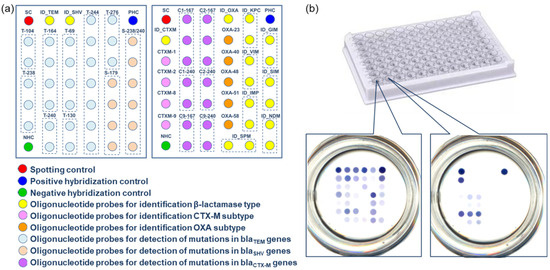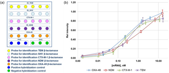 - Rubtsova, M.Y.; Ulyashova, M.M.; Pobolelova, Y.I.; Presnova, G.V.; Egorov, A.M. Biochip for simultaneous identification of beta-lactamase and carbapenemase genes conferring the bacterial resistance to beta-lactam antibiotics. Appl. Biochem. Microbiol. 2020, 56, 130–140. [Google Scholar] [CrossRef]