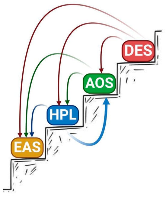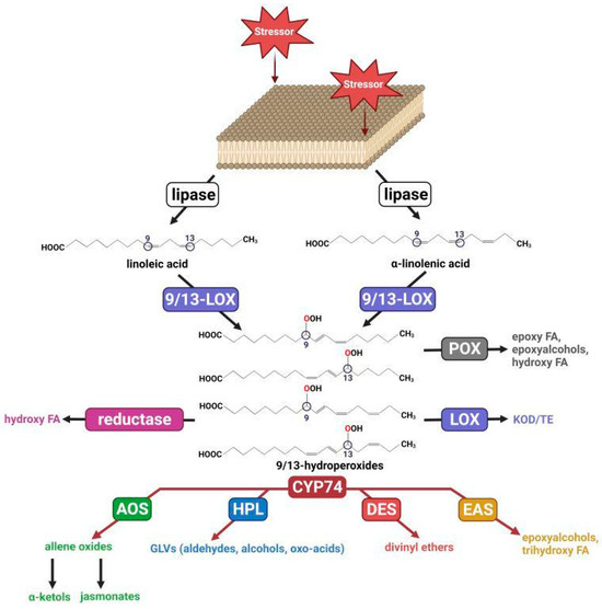 Scheme of lipoxygenase cascade. LOX—lipoxygenase; POX—peroxygenase; AOS—allene oxide synthase; HPL—hydroperoxide lyase; DES—divinyl ether synthase; EAS—epoxyalcohol synthase; FA—fatty acid; KOD/TE—ketooctadecadi(tri)enoic acid. This figure was created with BioRender.com (accessed on 28 November 2023).