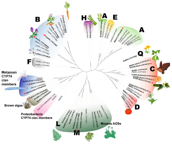 The unrooted phylogenetic tree of the CYP74 clan. Classified CYP74 subfamilies are marked with their letter designation (A, B, C, etc.). Subfamilies consisting of more than one member are outlined with unclosed curves (semi-ellipses). Enzymes exhibiting EAS activity are indicated in bold. True EASs are marked with red asterisks. The Plant CYP74s: As, Allium sativum AsDES, CYP74H1, GI: 83414021; Ao; Asparagus officinalis, AoDES, GI: 109845459; At, Arabidopsis thaliana; AtAOS, CYP74A1, GI: 15239032; AtHPL, CYP74B2, GI: 3822403; Ca, Capsicum annuum; CaHPL, CYP74B1, GI: 1272340, CaDES, CYP74D4, GI: 107840369; Cm, C. melo; CmHPL/EAS, CYP74C2, GI: 14134199; Csa, C. sativus; CsaHPL/EAS, CYP74C1_CS, GI: 101211324; CsaHPL/EAS/AOS, CYP74C31 GI: 101211574; CsaHPL, CYP74B6, GI: 101223126; Csi, Camellia sinensis; CsiHPL, CYP74B24, SI: BAU24783.1; Dc, D. carota; CYP74B33, GI: 108219710; Hv, Hordeum vulgare; HvAOS2, CYP74A3, SI: AJ251304.1; HvHPL, CYP74F3, CAC82980.1; Kf, Klebsormidium flaccidum (green alga); KfAOS, SI: LC032459.1; Le, S. lycopersicum; LeAOS1, CYP74A1, GI: 7581989; LeAOS2, CYP74A2, GI: 7677376; LeAOS3, CYP74C3, GI: 25991603; LeHPL, CYP74B3, GI: 7677378 LeDES, CYP74D4, GI: 543675; Lj, Lotus japonicus; LjHPL, CYP74B15, SI: AB600748.1; Lu, L. usitatissimum; LuAOS, CYP74A1, GI: 1352186; LuDES, CYP74B16, GI: 379048766; Mp, Marchantia polymorpha; MpAOS1, SI: LC032457.1, MpAOS2, SI: LC032458.1; Mt, M. truncatula; MtHPL3, CYP74B5, GI: 63081244; MtHPL1/EAS, CYP74C13_MT, GI: 33504430; Nt, N. tabacum; NtDES, CYP74D3; GI: 107799697; Os, Oryza sativa; OsAOS, CYP74A4, GI: 115455571; OsHPL1, CYP74E2, GI: 115445057; OsHPL2, CYP74E1, GI: 125538638; Pa, Parthenium argentatum; PaAOS, CYP74A1, GI: 218511958; Pd, Prunus dulcis; PdHPL, CYP74C5, GI: 33300600; Pg, Psidium guajava; PgHPL, CYP74B5, GI: 13183137; Pp, Physcomitrella patens; PpAOS1, CYP74A1, GI: 22217985; PpAOS2, CYP74A8, GI: 168014176; PpHPL, CYP74G1, GI: 76057841; Ra, R. acris; RaDES, CYP74Q1, GI: 768564485; Rj, R. japonicus; RjEAS, CYP74A88, SI: MK061531; Sm, S. moellendorffii; SmDES1, CYP74M1, GI: 9660714; SmEAS, CYP74M2, GI: 9637471; SmDES2, CYP74M3, GI: 9654395; SmHPL, CYP74L1, GI: 9645914; SmAOS, CYP74L2, GI: 9651730; CYP74L3, SI: EFJ25870; SmAOS, CYP74K3, SI: EFJ20163.1; St, S. tuberosum; StAOS2, CYP74A6, GI: 86769479; StAOS3, CYP74C10, GI: 56605358; StHPL/EAS, CYP74C4, GI: 102588560; StDES, CYP74D2, GI: 12667099; Vv, Vitis vinifera; VvHPL, CYP74B13, FJ861082; Zm, Zea mays; ZmAOS, CYP74A19, GI: 223947589; ZmHPL, CYP74F2, GI: 162462890. CYP74 clan members: Es, E. siliculosus (brown alga); EsEAS, CYP5164B1, GI: 1109557544; EsHPB, CAB1111511.1; Mn, Methylobacterium nodulans (proteobacteria); MnHPL, SI: WP_015932840.1; Msp, Methylobacterium sp. 4–46; MspCYP74, SI: WP_012335549.1. Ap, Acropora palmata (Metazoa); ApAOS, GI: 187948710; Bf, B. floridae (Metazoa); BfEAS, CYP440A1, GI: 189312561; Bb, B. belcheri; BbEAS/AOS, XP_019641998.1; Nv, N. vectensis (Metazoa); NvEAS CYP443D1, GI: 5516222; NvHPL/EAS CYP443C1; Pb, Plasmodiophora brassicae; PbHBP, CYP50918A1, CEO97746.1. The tree is drawn to scale, with branch lengths measured as the number of substitutions per site. The evolutionary history was inferred by using the Maximum Likelihood method (1000 replicates). Evolutionary analyses were conducted in MEGA7. The iTOL tool version 6.8.1 (https://itol.embl.de/) was used to visualize the phylogenetic model output. This figure was created with BioRender.com (accessed on 1 December 2023).