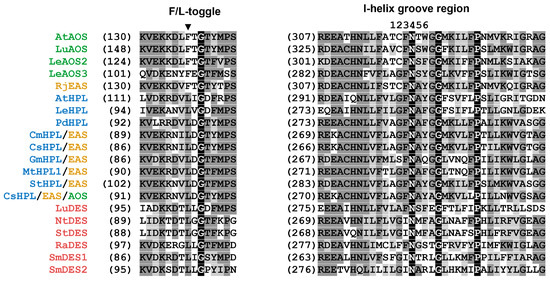 Multiple alignment of partial sequences of CYP74s: SRS-1 (left) and I-helix (right). The I-helix groove region (SRS-4) is numbered 1–6, the first glycine residue after this domain is marked with a ▼ symbol, and the F/L toggle site (SRS-1) is marked with an asterisk. The following CYP74 sequences were used for alignment: At, A. thaliana; AtAOS, NP_199079.1, AtHPL, Q9ZSY9.1; Cs, C. sativus; CsHPL/EAS, CYP74C1_CS, NP_001274399.1, CsHPL/EAS/AOS, CYP74C31, XP_004137005.1; Cm, C. melo; CmHPL/EAS, CYP74C2, NP_001284390.1; Gm, G. max; GmHPL/EAS, CYP74C13_GM, XP_028186824.1; Le, S. lycopersicum; LeAOS2, NP_001274707.1; LeAOS3, NP_001265949.1, LeHPL, AAF67142.1; Lu, L. usitatissimum; LuDES, ADP03054.2, LuAOS CYP74A1 P48417.1; Mt., M. truncatula; MtHPL/EAS, CYP74C13_MT, XP_003606860.1; Nt, N. tabacum; NtDES CYP74D3 NP_001312606.1; R. japonicus; RjEAS, CYP74A88, QCR70269.1; St, S. tuberosum; StHPL/EAS, CYP74C4_ST, XP_006365486.1; Sm, S. moellendorffii; SmDES1, CYP74M1, XP_002979266.1; SmEAS, CYP74M2 XP_002964012.2. Alignment was performed using Vector NTI 11 program (Invitrogene, Madison, WI, USA).